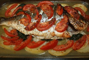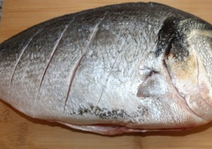 Mientras tanto limpiar la dorada. Esto se lo podéis pedir a vuestro pescadero, que os quite las tripas y la desescame. Hacer varios cortes en la piel.