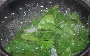 Escaldar las espinacas. Introducir en agua hirviendo con una pizca de sal, 1 minuto. Sacar y escurrir bien.