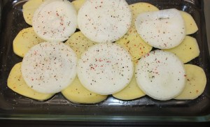 Untar una fuente de horno con aceite. Colocar las rodajas de patata y cebolla.