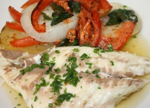 Lo podéis servir en la fuente del horno, o sacar los filetes y acompañar con las verduras, un poquito más laborioso. Espolvorear con perejil picado.