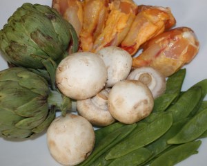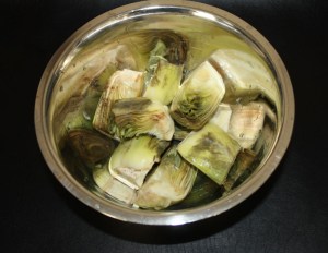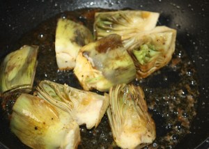 En la misma sartén donde hemos dorado el pollo, poner las alcachofas. Siempre fuego medio. 1 minutos.