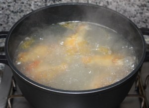 Pasar a la olla. Dejar cociendo 30 minutos antes de añadir las verduras.