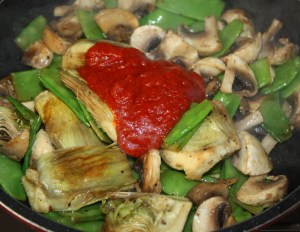 Añadir los tirabeques y los champiñones. Salpimentar. 2 minutos.