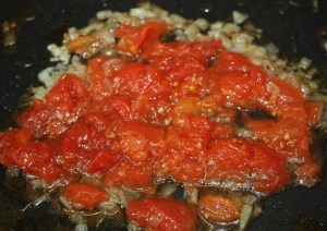 Añadir el tomate. 5 minutos a fuego medio. Dar golpecitos con una cuchara para que se vaya deshaciendo.