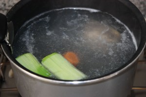 Para hacer el caldo de pavo, poner un cazo con dos vasos de agua, un trozo de pavo que tenga mucho hueso y poca carne, un trocito de puerro, media zanahoria y una pizca de sal. Dejar cociendo media hora. También podéis utilizar caldo de pollo casero o en tetrabrick, o a malas simplemente agua.