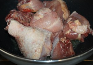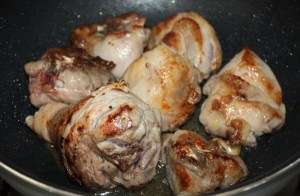 En una sartén con 6 cucharadas de aceite, dorar el pollo, previamente salado. 3 minutos a fuego fuerte.