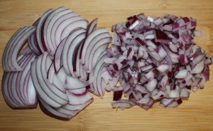 Pelar la cebolla. Cortar una mitad en juliana gruesa y picar la otra mitad.