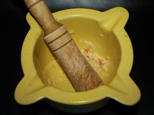 Pelar 2 ajos y majarlos en un mortero con una pizca de sal y la guindilla.