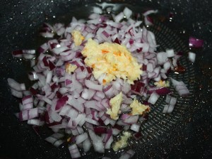 En la misma sartén donde hemos dorado el pavo, añadir otras 2 cucharadas de aceite. Rehogar la cebolla picada y los ajos majados. 5 minutos a fuego bajo.