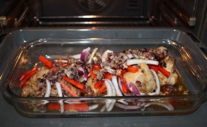 A los 20 minutos sacar la fuente del horno y añadir los gajos de naranja. Hornear 20 minutos más.