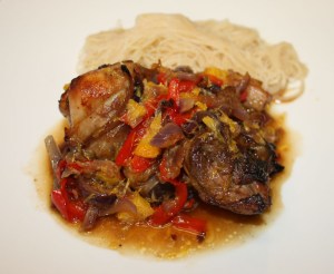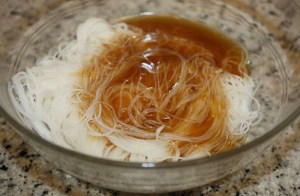 Por otra parte vamos a utilizar algunos productos asiáticos como la salsa de soja, el vinagre de arroz, el jengibre y los fideos de arroz. Todo esto lo podéis comprar en grandes supermercados o en tiendas especializadas en productos asiáticos ( suele haber en todos los mercados municipales). Podéis prescindir del jengibre y sustituir el vinagre de arroz por vinagre de vino blanco, pero en este caso en lugar de 6 cucharadas, añadir 3.