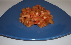 En un plato poner los dados de tomate, junto con el jugo.