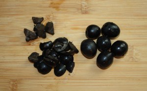 Con un cuchillo pequeño cortar trocitos de las aceitunas, eliminando el hueso. También se pueden utilizar aceitunas sin hueso y os ahorráis este trabajo.