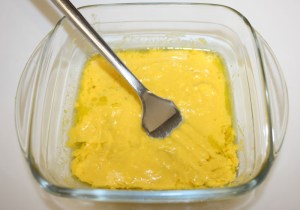 Añadir al bol 4 cucharadas de AOVE y dos cucharadas de zumo de naranja. Machacar con un tenedor hasta obtener una pasta.