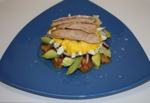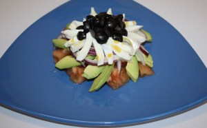 Encima poner en circulo el aguacate, sobre él la cebolla y encima de ella la clara de huevo. En el centro hacer un montoncito con las aceitunas y alrededor de ellas la vinagreta de yema.