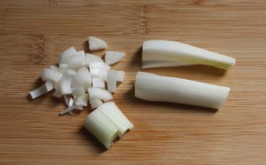 Quitar la parte verde de la cebolleta. Cortar por la mitad y cada mitad en dos a lo largo. Ir cortando rodajitas. Hacer lo mismo con la zanahoria.