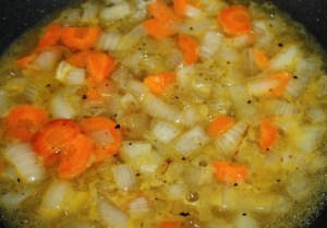En la misma sartén donde hemos dorado el pavo, añadir la cebolla y zanahoria con otras dos cucharadas de aceite. Salpimentar. 10 minutos a fuego medio.