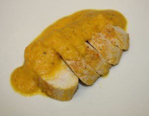 Trocear la pechuga y regar con la salsa.