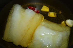 En un cazo colocar el bacalao con la piel hacia abajo, los dos ajos pelados y partidos por la mitad y la cayena. Cubrir con aceite. Que el cazo sea lo más pequeño posible, justo para que os quepa el pescado, para no utilizar mucho aceite.