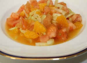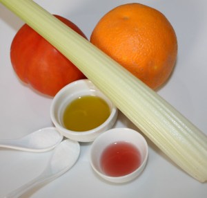 En un bol mezclar la naranja, tomate, apio, AOVE, vinagre, zumo reservado, azúcar y sal. Mezclar bien y meter en la nevera.