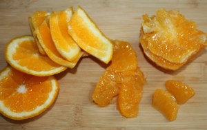 Pelar la naranja al vivo y cortar cada gajo por la mitad. Reservar una cucharada del zumo que suelta al cortarla, lo vamos a utilizar para aderezar la ensalada.