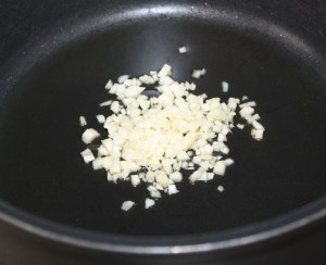 En una olla, o sartén grande, poner 4 cucharadas de aceite y los ajos picados. 5 minutos con el fuego al mínimo. Los ajos se queman fácilmente y amargan mucho.