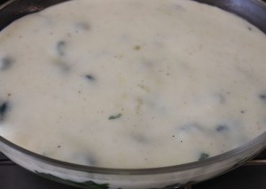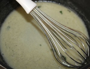 En cuanto se haya disuelto poner la leche, es importante no dejar la harina mucho tiempo o se quemará. Añadir también la nuez moscada y una pizca de sal. Volver a mover sin parar con las varillas hasta que espese, no demasiado ya que después va a ir al horno.