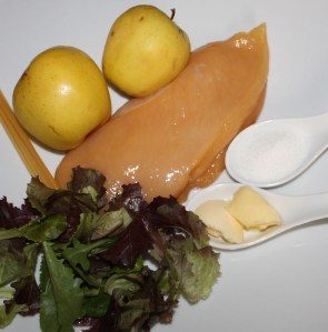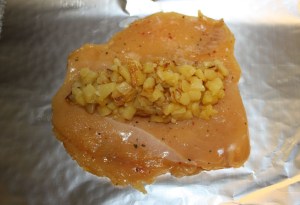 Poner la pechuga encima de papel de plata. Colocar en el centro la manzana.