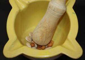 En un mortero triturar los frutos secos, no mucho, que no quede un polvo, queremos que se noten los trocitos. Añadir el AOVE y el vinagre. Mezclar bien.
