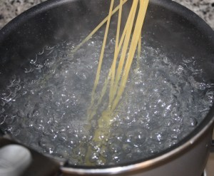 Mientras tanto cocer los espaguetis. Escurrir y freír en abundante aceite.