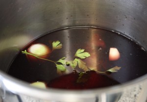 En una olla rápida poner las costillas con el vino tinto, agua, cebolla pelada y partida por la mitad, 2 ramas de perejil y 2 ajos pelados y partidos por la mitad. Fuego fuerte. Cuando suban los anillos o comience a pitar, bajar el fuego al mínimo y dejar 30 minutos.