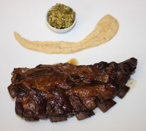 Colocar el costillar en una fuente con el puré en un lado y el majado en cuenco para que cada uno se ponga lo que quiera. Servir con la salsa que queda en la fuente de horno en una jarrita.