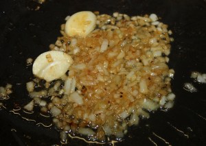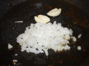 En la misma sartén que hemos utilizado, poner la cebolla picada y el ajo pelado y partido por la mitad. Salpimentar.