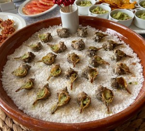 Colocar los caracoles con los pinchos clavados en la sal. Espolvorear con pan rallado y meter en el horno a gratinar 4 minutos, justo antes de servir.