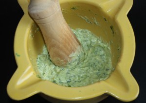 En un mortero majar los ajos pelados y las hojas de perejil. Que quede una pasta.