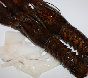Trocear el bogavante. Primero quitar las tenazas. Cortar la cabeza y después el cuerpo por las juntas. El jugo que suelta al cortarlo meterlo en la cazuela donde tenemos el calamar cociendo.