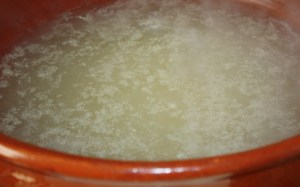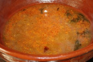 En una cazuela honda de barro, o la que tengáis, poner el caldo de pescado. Cuando comience a hervir, bajar el fuego al mínimo y añadir el calamar troceado, aros, cuadraditos….como más os guste. Tapar. Dejar cociendo 1 hora.