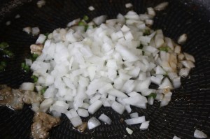 En esa misma sartén poner el pimiento y la cebolla con una pizca de sal. 5 minutos a fuego medio.