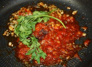 Momento de poner el perejil y la carne de la ñora. Un par de minutos a fuego medio.