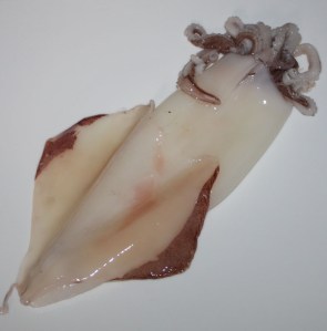 Quitar los tentáculos y las aletas del calamar y abrirlo por la parte de atrás, tiene una pequeña raya por la que cortarlo os resultará muy fácil.