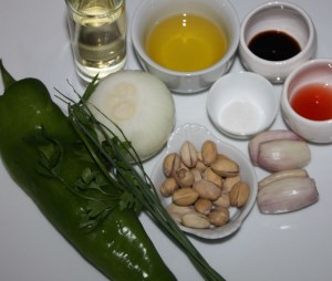 Mientras se hace la verdura vamos con la vinagreta. En un mortero machacar los pistachos. Añadir el cebollino picado, las 4 cucharadas de AOVE, los vinagres, el vino blanco y una pizca de sal. Mezclar bien.