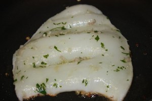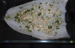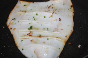 Podéis utilizar esa misma sartén añadiendo dos cucharadas de aceite. Cuando esté bien caliente poner el calamar con los cortes hacia abajo. 1 minuto.