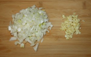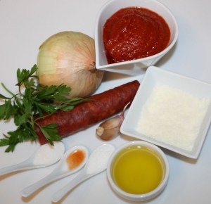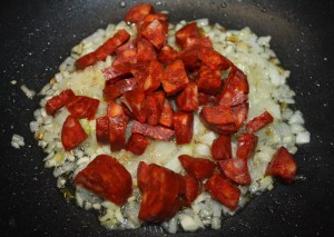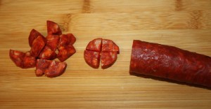 Mientras se va pochando la cebolla y el ajo, pelar el chorizo, cortar en rodajas y cada rodaja en cuatro.