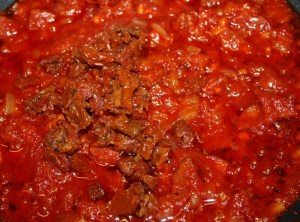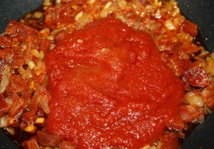 Incorporar el tomate frito y el azúcar. Seguir rehogando 10 minutos a fuego suave. Mover de vez en cuando.