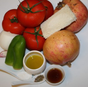 Introducir todos los ingredientes en la thermomix o el robot de cocina que tengáis: granada, tomate, cebolla, pimiento, ajo, pan, 1 cucharada de AOVE, sal y pimienta.