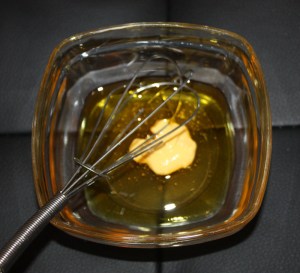 En un cuenco poner las 3 cucharadas de AOVE, la miel, la mostaza y una pizca de sal. Emulsionar con unas varillas.