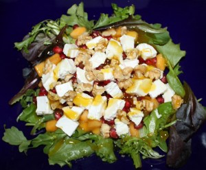Colocar en un plato los brotes tiernos ( para 2 personas 1/3 de bolsa ). Poner encima los granos de granada y los dados de caqui. A la vinagreta no le he puesto vinagre ya que el ácido ya lo aporta el limón donde tenemos macerando los dados de caqui. Ya solo nos falta colocar los dados de queso y las nueces desmenuzadas con las manos. Terminar regando con la vinagreta.