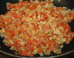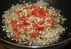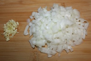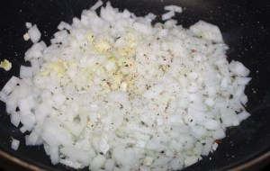 En la misma sartén rehogar la cebolla y ajo, añadiendo las otras 3 cucharadas de aceite. 10 minutos bajando el fuego al mínimo. Salpimentar.