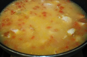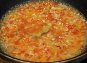 Incorporar el laurel y el vino. 3 minutos con el fuego al máximo para que se evapore el alcohol.