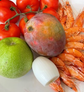 En un bol mezclar los langostinos picados, la cebolleta, el mango, la manzana, 1 anchoa picada, zumo de medio limón, sal y pimienta. Mezclar bien y meter en el frigo 1 hora, tapado con film. Mientras tanto vamos a hacer el zumo de tomate.